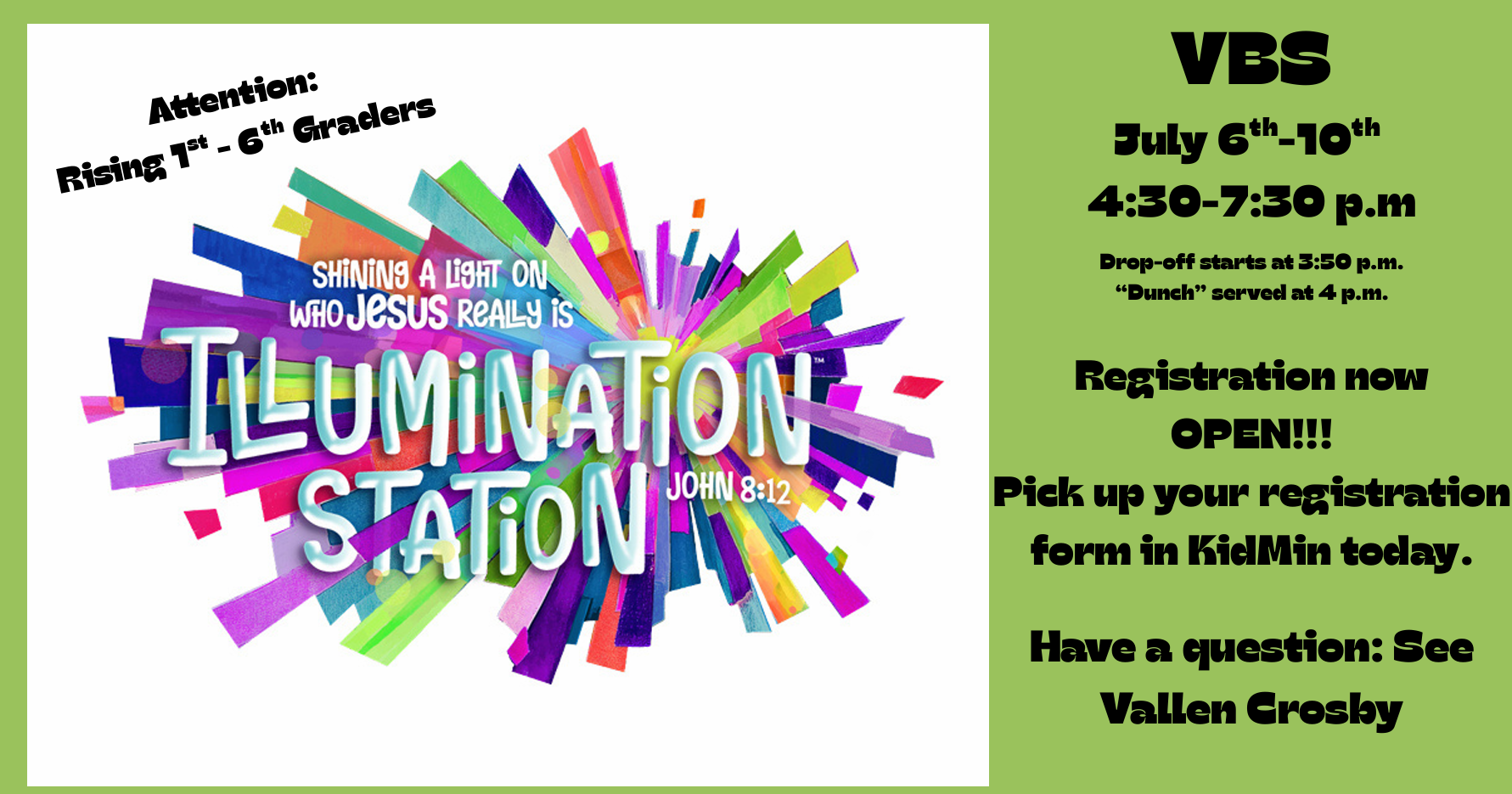 A member and ready to serve? See Vallen Crosby to volunteer and help make this VBS the brightest one yet!